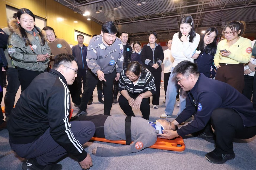 活动现场特别设置基于虚拟仿真场景的应急科普平台演示环节,由医路有我应急急救志愿服务队现场展示前沿科普技术。来自北京急救中心、北京朝阳医院、北京同仁医院、北京明德医院的医学专家、资深护理骨干组成的专业志愿者团队,以“理论精讲+实操演练”的形式,为来自亦庄各社区和企业的130余名工作人员及志愿者开展系统培训,内容涵盖心肺复苏(CPR)、创伤应急处理等核心急救技能,所有参与者均顺利通过考核并获颁相关证书。